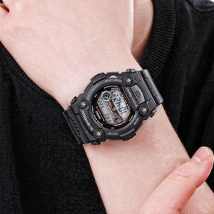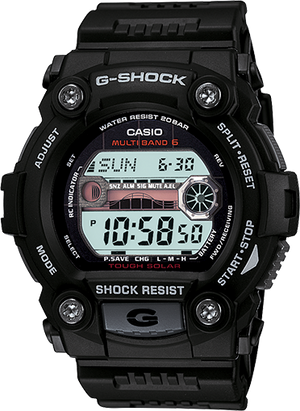 The G-SHOCK G-Rescue series combine tough, high-performance digital timekeeping with radio-controlled accuracy. Large buttons are designed to allow operation while wearing thick gloves, for even those with protective clothing. Tide Graph and Moon Phase features show tide and moon information for preset areas. Other advanced features include highly shock-resistant construction, a Tough Solar power system, MULTIBAND 6 reception of six time calibration signals around the globe, and much more. Tough Solar Power. Shock resistant. Size of case 52.4 x 50.0 x 17.7mm. 200M Water resistant. Full Auto EL Backlight with Afterglow. Tide Graph (tide level for specific date and time). Moon Data (moon age of the specific date and moon phase graph). World Time. 4 Daily Alarms and 1 Snooze Alarm. Hourly Time Signal. 1/100 second stopwatch. Measuring modes: Elapsed time, split time, 1st-2nd place times. Countdown Timer. Measuring unit: 1 second. Input range: 1 minute to 24 hours (1-minute increments and 1-hour increments). Battery power indicator. Power saving function. Button operation tone on/off. Full Auto Calendar (pre-programmed until the year 2099). 12/24 Hour Formats.