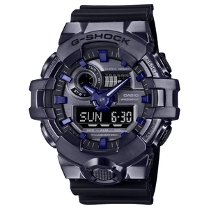 Introducing the G-STEEL GM700, the latest in the line of globally popular analog-digital G-SHOCK timepieces featuring the classic big case. Inheriting the solid, fashionable stainless-steel bezel design of the GM5600, GM6900, and GM110, the GM700 is based on the GA700, taking it into all-new terrain with a metal bezel in one of three different colors. The silver and gold color bezels highlight the natural bold look of the metals they project. The striking look of the GM700P-6A is achieved with purple accents against a dark dial and complimented by a purple ion plated bezel. The front button design makes it easy to access the LED light to illuminate the dial for a high-visibility, easy read at night and in dark places.