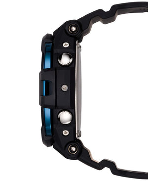 Black resin case with a black resin strap. Fixed black and blue resin bezel. Black Analog-digital dial with luminous hands and index hour markers. Arabic numerals mark the 3, 9 and 12 o'clock positions. Minute markers around the outer rim. Dial Type: Analog-digital. Luminescent hands and markers. Full auto calendar. Quartz movement. Scratch resistant mineral crystal. Solid case back. Case dimensions: 50.8 mm x 52.1 mm. Case thickness: 16.7 mm. Round case shape. Tang clasp. Water resistant at 200 meters / 660 feet. Functions: hour, minute, second, date, digital compass, thermometer, world time, hourly time signal, countdown timer. Luxury watch style. Casio G Shock Black Dial Black Resin Men's Watch GA1000-2B.