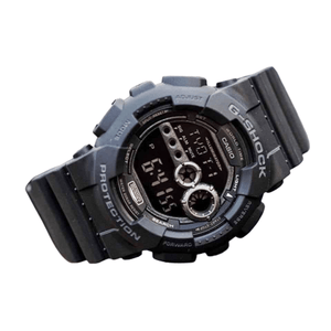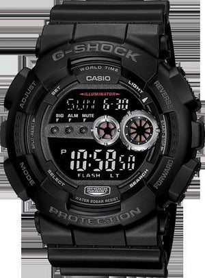 Black resin case with a black resin bracelet. Fixed black resin bezel. Black digital dial. Hours, minutes, seconds, am/pm, day of the week and date. Dial Type: digital. Luminescent auto led light. Full calendar. Casio Calibre 3263 quartz movement. Scratch resistant mineral crystal. Solid case back. Round case shape, case size: 55 x 51.2 mm, case thickness: 17.4 mm. Tang clasp. Water resistant at 200 meters / 660 feet. Functions: hours, minutes, seconds, am/pm, date, multi-function, world time, alarm, chronograph. Additional Info: 1/100-second stopwatch. 12/24-hour format. 5 independent alarms. world time 31 time zones. Military watch style. Item Variations: GD100 1B, GD100.1B, GD1001B. Casio G-Shock Military Mens Watch GD100-1B.