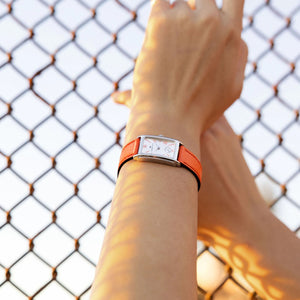 A vibrant coral leather strap and matching-in-color Roman numerals take the Lady Ardmore Quartz from a subtle Art Deco revival to a decadent of-the-moment statement maker. Sophisticated and fun, the angular case seamlessly blends American Classic style with contemporary colorways for a look that is sure to turn heads. Stainless steel case with orange leather strap, silver dial. Quartz movement. Case size 18.7mm x 27mm. Water resistance upto 30 meters. Mineral crystal. Pin buckle clasp.