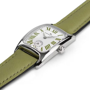 Featuring an artfully curved case shape and distinctive Art Deco design, the Hamilton Boulton M is reimagined in bold colors inspired by classic macaron flavors. The timepiece's beautiful pearl white dial is enhanced with Roman numerals in pistachio green and complemented by a matching leather strap to complete the look. Exploring a palette of delicious color combinations, the Hamilton Boulton is an enticing sweet treat for the wrist. Seamlessly marrying the old and the new, this timepiece exudes feminine flair that is both fresh and timeless.