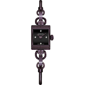 The perfect balance of 1950's charm and contemporary whimsy, the Lady Hamilton Vintage Quartz trades in its traditional metal tones for a warm black and deep plum colored bracelet and case, respectively. Paired with a stunning sunray brushed black dial featuring four sparkling diamonds, this unique watch won't ever fade into the darkness. Quartz movement. Case size 15mm x 19mm. Water resistance upto 50 meters. Sapphire crystal. Folding clasp.