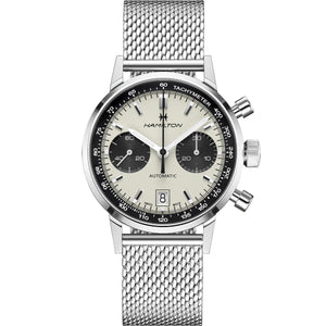 A modern take on a 1968 signature piece, the Intra-Matic Auto Chrono with its sporty but classic design and distinctive panda dial is sure to catch the eye. The vintage-inspired favorite is paired with a finely engineered stainless steel mesh bracelet for the ultimate in comfort and style. Stainless steel case and bracelet with white dial. Automatic movement. Case size 40mm. Water resistance up to 100 meters. Sapphire crystal. Folding clasp.