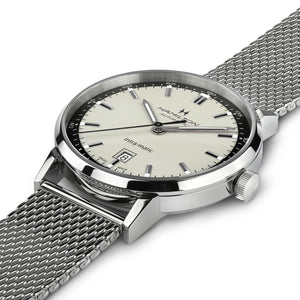 With a striking two-tone dial, the Intra-Matic Automatic has a vintage-infused style that will transition from the office to a weekend getaway without missing a beat. Powered by our exclusive H-10 movement featuring the anti-magnetic alloy Nivachron, this standout 40mm timepiece is precise, reliable and full of character. Stainless steel case and bracelet with a, white dial. Automatic movement. Case size 40mm. Water resistance upto 50 meters. Sapphire crystal. Folding clasp.