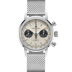 Feel the emotion at the heart of watchmaking with each wind of the Intra-Matic Chronograph H. Powered by our new, exclusive hand-wound chronograph movement the H-51 this is a timepiece with soul. A box-shaped sapphire crystal with double anti-reflective coating protects our signature panda dial, adding another layer of authentic heritage to this mechanical version of a vintage-inspired favorite. Stainless steel case and bracelet with white dial. Mechanical movement. Case size 40mm. Water resistance upto 100 meters. Sapphire crystal. Folding clasp.