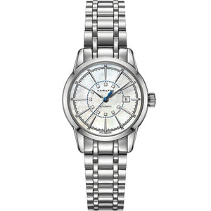 Hamilton has made a long journey since the days when our original pocket watches ensured accuracy and safety on the American railroads. Adding a ladies' line to the RailRoad collection is testament to how times have moved on. Precise, practical and versatile, they also offer a touch of feminine charm with models including diamonds, mother of pearl dials and soft leather straps. Stainless steel case and bracelet with mother of pearl dial. Automatic movement. Case size 32mm. Water resistance up to 50 meters. Sapphire crystal. Folding clasp.