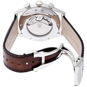 Inspired by Andrew Hamilton, an eighteenth-century campaigner for freedom of speech and owner of the site of the original Hamilton watch factory in Pennsylvania, these timepieces build a strong bridge from history to today. The H-21 chronograph movement, with a typical power reserve of 60 hours, propels this timepiece into the 21st century while the leather straps carrying the inscription "Without liberty, life is a misery" reference Hamilton's rich heritage. Stainless steel case with a brown leather strap, silver dial. Case size 42mm. Water resistance upto 50 meters. Automatic movement. Sapphire crystal. Folding clasp.