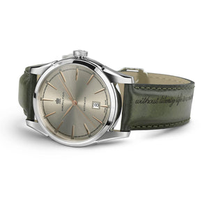 The Spirit of Liberty is alive and well in these inspiring automatic models that draw on the classic American style Hamilton originally established in Pennsylvania in 1892. With an injection of 21st century watchmaking technology in the shape of the awesome H-10 automatic movement with up to 80 hours power reserve, you'll have the freedom to experience a timeless weekend without missing a beat come Monday morning. Stainless steel case with a green calf leather strap, brown dial. Case size 42mm. Water resistance upto 50 meters. Sapphire crystal. Folding clasp.