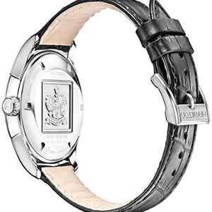 The strong but understated look offered by the Valiant is perfect for the self-assured gentleman. Keeping your timekeeping style pared down allows you the chance to shine as you stand out for all the right reasons. Stainless steel case with a black leather strap, silver dial. Case size 40mm. Water resistance upto 50 meters. Automatic movement. Sapphire crystal. Pin buckle.