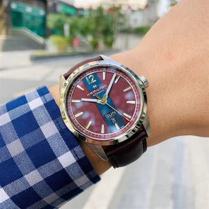 Whatever your work attire, the Broadway Day Date Automatic will keep pace with your look as well as keeping you on time. Powered by your own movements, it's perfectly suited to dynamic days and evenings spent entertaining. With a range of dial designs and a choice of straps, it's a faithful personal assistant designed to fit your busy lifestyle. Stainless steel case with a brown calf leather strap, aubergine dial. Case size 42mm. Water resistance upto 50 meters. Automatic movement. Sapphire crystal. Folding clasp.