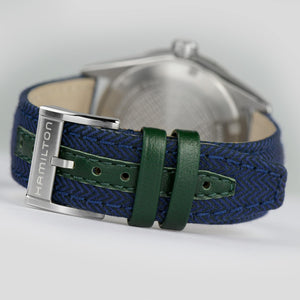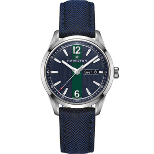 Contrasting textures, modern color combinations and the reliability and functionality you'd expect from a Hamilton. The Broadway Day Date Quartz is a watch that truly lets you be you. Choose the dial and strap combination that expresses your individuality for stand out style. Stainless steel case with a blue textile strap, blue dial. Case size 40mm. Water resistance upto 50 meters. Quartz movement. Sapphire crystal. Pin buckle.