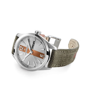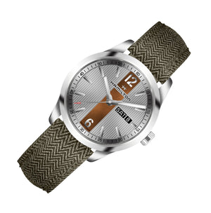 Contrasting textures, modern color combinations and the reliability and functionality you'd expect from a Hamilton. The Broadway Day Date Quartz looks at both sides of the equation for a watch that equals more than the sum of its parts. Choose the dial and strap combination that expresses your individuality for stand out style. Stainless steel case with a green textile strap, grey dial. Quartz movement. Case size 40.Water resestant upto 50 meters Sapphire crystal. Pin buckle.