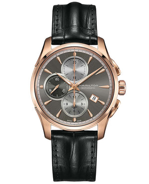 The Jazzmaster Auto Chrono is a watch that easily adapts to the rhythms of modern living while still dancing to the beat of its own drum. For those who love tradition but appreciate innovation, the H-21 with its 60 hours of power reserve is housed in a case of gentle curves and clean lines. Stainless steel rose PVD coating case with black calf lather strap, grey dial. Automatic movement. Case size 42mm. Water resistance up to 100 meters. Sapphire crystal. Pin backle clasp.