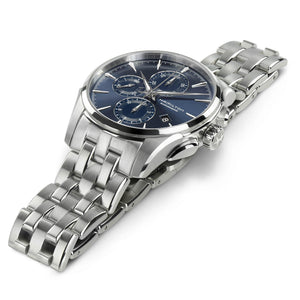 The Jazzmaster Auto Chrono is a watch that easily adapts to the rhythms of modern living while still dancing to the beat of its own drum. For those who love tradition but appreciate innovation, the H-21 with its 60 hours of power reserve is housed in a case of gentle curves and clean lines. Stainless steel case and bracelet with a, blue dial. Automatic movement. Case size 42mm. Water resistance upto 100 meters. Sapphire crystal. Butterfly clasp.