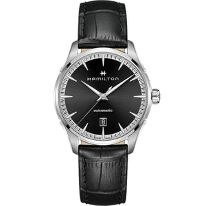 With a sophisticated design, the Jazzmaster Auto is a contemporary timepiece to suit your day from business time to night-out. Powered by an automatic movement that features a hairspring made from the new anti-magnetic alloy NivachronTM, this 40mm watch keeps precise time all week long. Stainless steel case with a black leather strap, black dial. Automatic movement. Case size 40mm. Water resistance upto 50 meters. Sapphire crystal. Pin buckle.