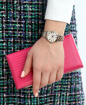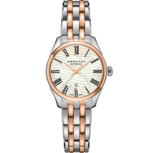Small but perfectly formed, this Jazzmaster Lady has a compact 30 mm case, opulent mother of pearl dial with wave pattern. With Roman numerals completing the traditional feel, it's sure to appeal to ladies who like classic jewelry. Two tone stainless steel with rose gold pvd case and bracelet, mother of pearl dial. Automatic movement. Case size 30mm. Water resistance upto 50 meters. Sapphire crystal. Folding clasp.