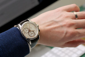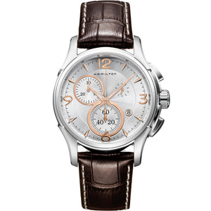 When your head says a traditional watch will be appropriate on every occasion, but the heart desires something with an eye-catching, sporty feel, the Jazzmaster Chrono Quartz is everything you're looking for. Stainless steel case and with a brown leather strap, silver dial. Case size 42mm. Water resistance upto 100 meters. Quartz movement. Sapphire crystal. Pin buckle.