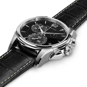 When your head says a traditional watch will be appropriate on every occasion, but the heart desires something with an eye-catching, sporty feel, the Jazzmaster Chrono Quartz is everything you're looking for. Stainless steel case with a black leather strap, black dial. Quartz movement. Case size 42mm. Water resistance upto 100 meters. Sapphire crystal. Pin buckle.