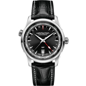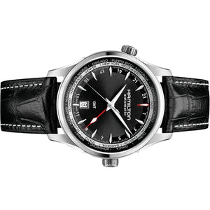 With its second time zone the Jazzmaster GMT can make sure you're in two places at once. Whether you're a business traveler living between cosmopolitan capitals or you want to keep your mind on your next holiday destination, it's sure to help you broaden your horizons. Stainless steel case with black leather strap and black dial. Case size 42mm. Water resistance up to 50 meters. Automatic movement. Mineral crystal. Folding clasp.