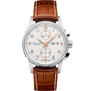 When timing is the key to success, it's important to have a timepiece that you can rely on for precision - and that looks the part. Whether on the wrist of a conductor, a musician or an appreciative listener, the Jazzmaster Maestro Auto Chrono always strikes the perfect tone. Stainless steel case and with a brown leather strap, white dial. Case size 41mm. Water resistance upto 100 meters. Automatic movement. Sapphire crystal. Pin buckle.