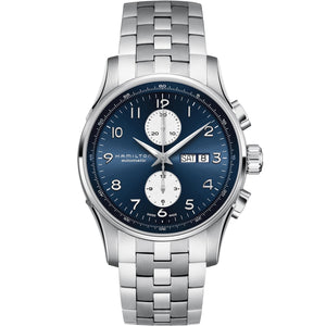 When timing is the key to success, it's important to have a timepiece that you can rely on for precision - and that looks the part. Whether on the wrist of a conductor, a musician or an appreciative listener, the Jazzmaster Maestro Auto Chrono always strikes the perfect tone. Stainless steel case and bracelet with blue dial. Case size 45mm. Water resistance upto 100 meters. Automatic movement. Sapphire crystal. Folding clasp.