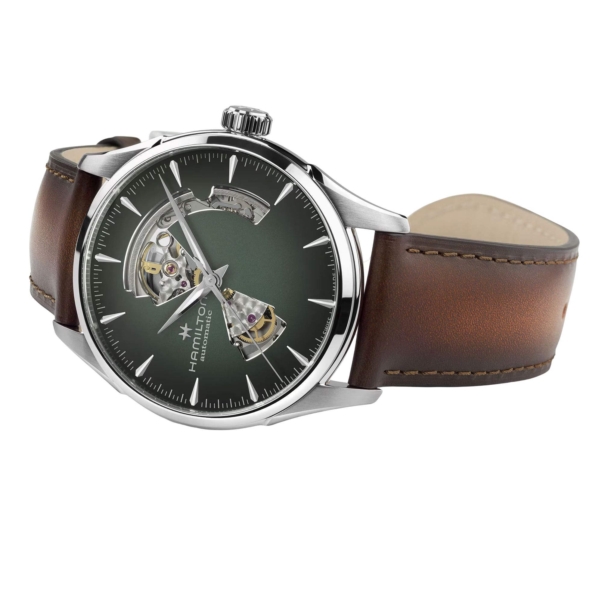 Offering a glimpse of its powerful inner mechanics, the Jazzmaster Open Heart lets precision take center stage with a new 42mm dial. Featuring a stunning gradient colour effect in rich green, this timepiece reveals its subtle beauty and showcases Hamilton's ever-evolving craftsmanship and attention to detail. Bringing the H-10 automatic movement into the spotlight, with an 80 hour power reserve and Nivachron™ balance spring, the Jazzmaster Open Heart Auto is fitted with a timeless, smoky brown leather strap. Discover our collection of dress watches.