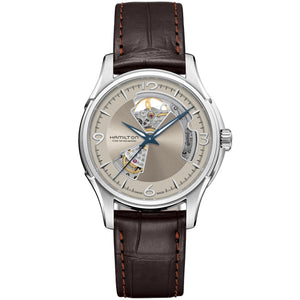 Perfectly balancing tradition and innovation, the Jazzmaster Open Heart offers a glimpse of its precision Swiss automatic movement in action. Using quality materials and featuring a range of dial and strap combinations, it's a collection that shows Hamilton at its best. Stainless steel case with a brown leather strap, silver dial. Automatic movement. Case size 40mm. Water resistance upto 50 meters. Sapphire crystal. Pin buckle.