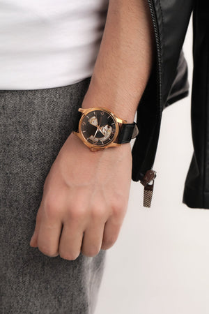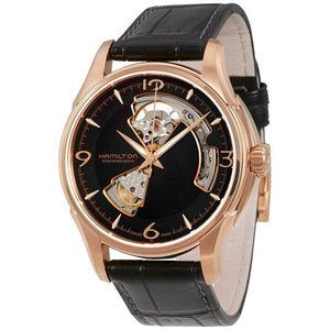Perfectly balancing tradition and innovation, the Jazzmaster Open Heart offers a glimpse of its precision Swiss automatic movement in action. Using quality materials and featuring a range of dial and strap combinations, it's a collection that shows Hamilton at its best. Stainless steel rose gold PVD coating case with a black leather strap, black dial. Case size 40mm. Water resistance upto 50 meters. Automatic movement. Sapphire crystal. Pin buckle.