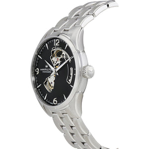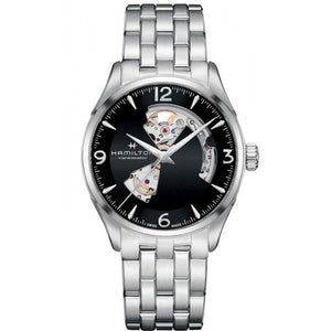 Perfectly balancing tradition and innovation, the Jazzmaster Open Heart offers a glimpse of its precision Swiss automatic movement in action. Using quality materials and featuring a range of dial and strap combinations, it's a collection that shows Hamilton at its best. Stainless steel case and bracelet with black dial. Case size 42mm. Water resistance upto 50 meters. Automatic movement. Sapphire crystal. Folding clasp.