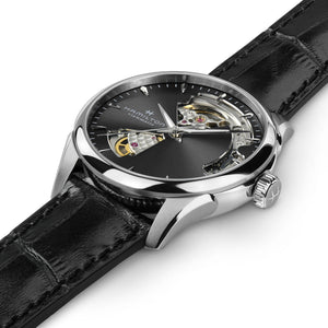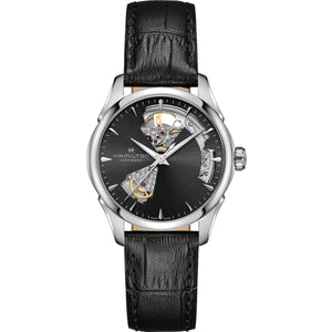 The Jazzmaster Open Heart 36mm perfectly balances contemporary sophistication with refined craftsmanship. A precise cut-out design reveals our Swiss-made automatic movement in action as it keeps time through all of life's beautiful moments. A variety of dial and strap combinations made from high quality materials offer a range of options for the modern woman. Stainless steel case and with a black leather strap, black dial. Case size 36mm. Water resistance upto 50 meters. Automatic movement. Sapphire crystal. Pin buckle.