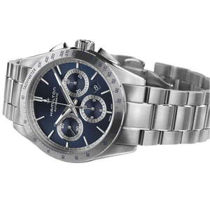 Made for those who favor function and style at once, the Jazzmaster Performer line offers a powerful sport-chic appearance. Powered by the H-31 automatic chronograph movement with 60 hours power reserve, this Jazzmaster Performer Automatic Chronograph features a 42mm stainless steel case accented by a sleek dark blue dial and an assertive stainless steel bracelet.