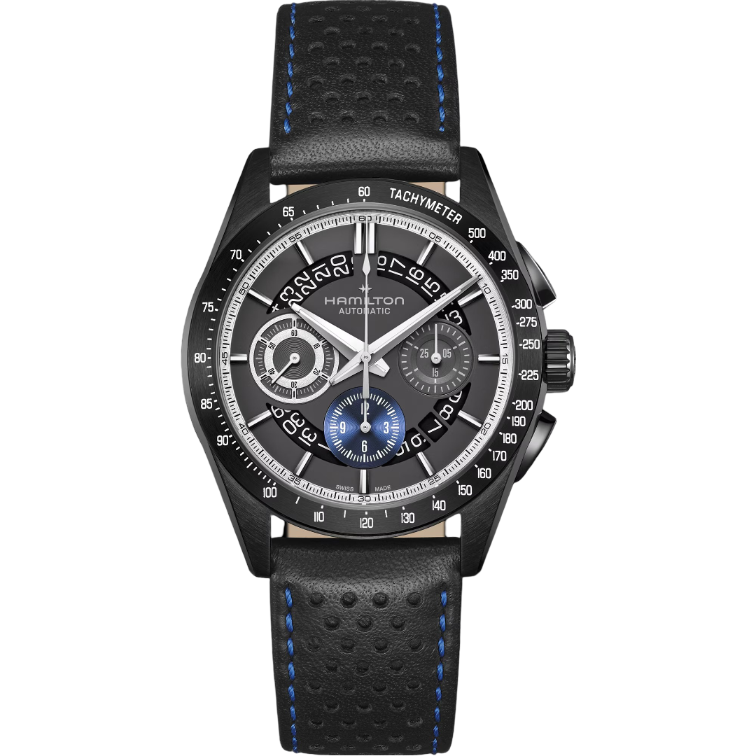 Timeless style with a new expression, the Jazzmaster Performer Auto Chrono 42mm embodies a contemporary take on the everyday watch, whilst retaining its signature sporty attitude. Displaying time on the outer ring, the three chronograph counters enable you to keep track of elapsed hours, minutes and seconds. Housed in a sleek PVD case and paired with a black leather strap, the Jazzmaster Auto Chrono 42mm features a 60 hour power reserve and an H-31 movement. Discover our collection of chronograph watches.