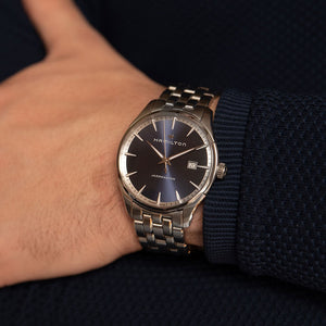 Understated, yet bold, the Jazzmaster Gent is a contemporary take on a traditional watch. Sophisticated, simple and tastefully designed, this quartz watch is the perfect choice for the distinguished gentleman. Stainless steel case and bracelet with, blue dial. Quartz movement. Case size 40mm. Water resistance upto 50 meters. Sapphire crystal. Folding clasp.