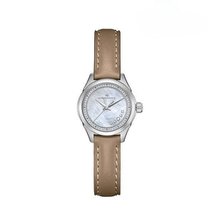Hamilton Jazzmaster Lady Quartz Women's Watch H32111890 Stainless steel case with beige cow leather strap, mother of pearl dial. Quartz movement. Case size 26mm. Water resistance up to 50 meters. Sapphire crystal. Pin buckle clasp.