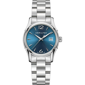 The simple, unassuming style of the Jazzmaster Lady quartz models creates an image of grace and poise. In a class of its own, the collection offers a range of dial sizes and strap combinations that ensure there's a version to suit individual tastes. Simple and simply stunning. Stainless steel case and bracelet with blue dial. Quartz movement. Case size 34mm. Water resistance up to 50 meters. Sapphire crystal. Folding clasp.