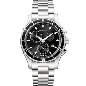 Time and tide wait for no man. Nor do they need to with the Jazzmaster Seaview collection with its sports inspired case and rotating bezel. Quality and precision quartz movements are the reliable heart of these models, which balance seafaring style with traditional timekeeping. Stainless steel case and bracelet with black dial. Case size 44mm. Water resistance upto 100 meters. Quartz movement. Sapphire crystal. Folding clasp.