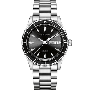 Time and tide wait for no man. Nor do they need to with the Jazzmaster Seaview collection with its sports inspired case and rotating bezel. Quality and precision quartz movements are the reliable heart of these models, which balance seafaring style with traditional timekeeping. Stainless steel case and bracelet with a, black dial. Quartz movement. Case size 42mm. Water resistance upto 100 meters. Sapphire crystal. Folding clasp.