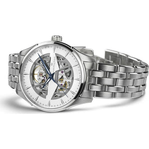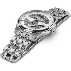 Precision and beauty are on display in the Jazzmaster Skeleton. Hamilton's bold design signature is integrated into a cut-out dial that reveals the highly technical internal mechanics of this captivating and unique timepiece. Stainless steel case and bracelet with, white dial. Case size 40mm. Water resistance upto 50 meters. Automatic movement. Sapphire crystal. Folding clasp.