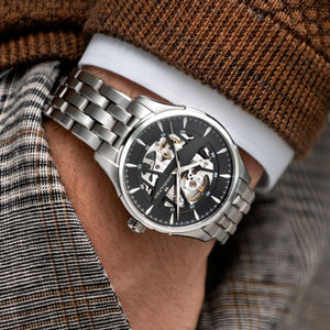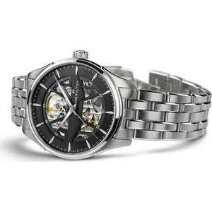 Precision and beauty are on display in the Jazzmaster Skeleton. Hamilton's bold design signature is integrated into a cut-out dial that reveals the highly technical internal mechanics of this captivating and unique timepiece. Stainless steel case and bracelet with, anthracite dial. Case size 40mm. Water resistance upto 50 meters. Automatic movement. Sapphire crystal. Folding clasp.