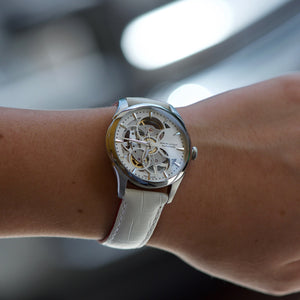 The Jazzmaster Viewmatic Skeleton Lady displays the hairspring, escapement and barrel of the H-10-S movement as they work seamlessly and relentlessly together, keeping time ticking. The skeletonized dial hides very little and leaves nothing to the imagination as Hamilton pulls out all the stops to display our watchmaking know how. Stainless steel case with leather strap white dial. Automatic movement. Case size 36mm. Water resistance upto 50 meters. Sapphire crystal. Pin buckle.