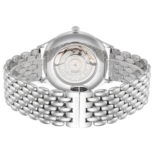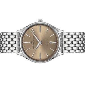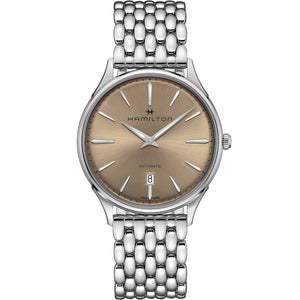 With the Jazzmaster Thinline Automatic, you can create a Hamilton timepiece tailored to suit your style. There is a range of different dial and strap combinations to choose from and, with the Hamilton EasyClick system, you can change your strap or bracelet to suit your mood in a matter of seconds. Stainless steel case and bracelate with beige dial. Case size 40mm. Water resistance upto 50 meters. Automatic movement. Sapphire crystal. Butterfly.
