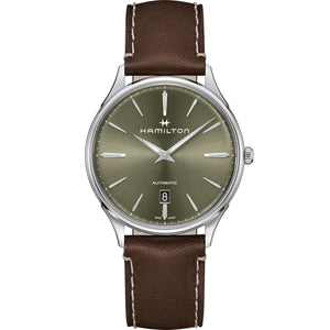 With the Jazzmaster Thinline Automatic, you can create a Hamilton timepiece tailored to suit your style. There is a selection of dial and strap color combinations to choose from so you can change your strap to suit your mood – quickly and simply, thanks to the EasyClick system. With options ranging from rich, warm colors to cooler hues, the Jazzmaster Thinline is everything you want it to be. Stainless steel case with a brown leather strap, and grey dial. Case size 40mm. Water resistance up to 50 meters. Automatic movement. Sapphire crystal. Pin buckle.