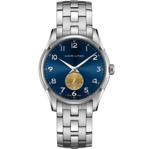 The slim case of the Jazzmaster Thinline creates a clean, streamlined appearance that will make an impression in a light, subtle way, offering a traditional look that will never go out of style. The Small Second adds a level of complication that still fits neatly in the slimline case. Stainless steel case and bracelet with, blue dial. Quartz movement. Case size 40mm. Water resistance upto 50 meters. Sapphire crystal. Butterfly clasp.