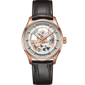 The Jazzmaster Viewmatic Skeleton Gent displays the hairspring, escapement and barrel of the H-10-S movement as they work seamlessly and relentlessly together, keeping time ticking. The skeletonized dial hides very little and leaves nothing to the imagination as Hamilton pulls out all the stops to display our watchmaking know how. Stainless steel rose gold PVD coating case with a brown leather strap, silver dial. Case size 40mm. Water resistance upto 50 meters. Automatic movement. Sapphire crystal. pin buckle.