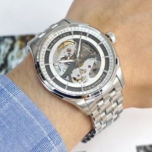 The Jazzmaster Viewmatic Skeleton Gent displays the hairspring, escapement and barrel of the H-10-S movement as they work seamlessly and relentlessly together, keeping time ticking. The skeletonized dial hides very little and leaves nothing to the imagination as Hamilton pulls out all the stops to display our watchmaking know how. Stainless steel case and bracelet with, silver dial. Case size 40mm. Water resistance upto 50 meters. Automatic movement. Sapphire crystal. Folding.