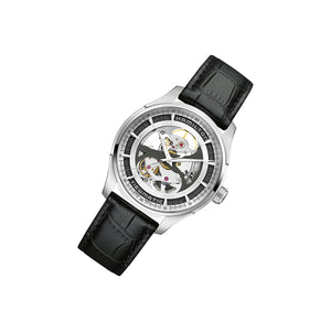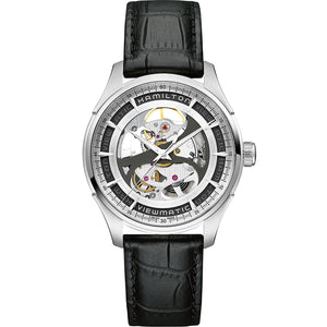 The Jazzmaster Viewmatic Skeleton Gent displays the hairspring, escapement and barrel of the H-10-S movement as they work seamlessly and relentlessly together, keeping time ticking. The skeletonized dial hides very little and leaves nothing to the imagination as Hamilton pulls out all the stops to display our watchmaking know how. Stainless steel case with ablack leather strap, silver dial. Automatic movement. Case size 40mm. Water resistance upto 50 meters. Sapphire crystal. Pin buckle.