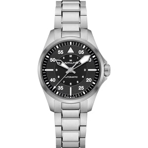 Crafted for true aviation lovers, the Khaki Pilot Auto evokes the spirit of exploration and adventure of the Khaki. Powered by the H-10 automatic movement with an 80-hour power reserve and Nivachron™ balance spring, the 36mm versions answer the trend for smaller watches. While up to the standards of precision for the cockpit, these more compact designs lend themselves to life in the skies and on terra firma. The Khaki Pilot Auto pairs a timeless stainless-steel bracelet with a stylish black dial and special Super-LumiNova coating for greater readability.