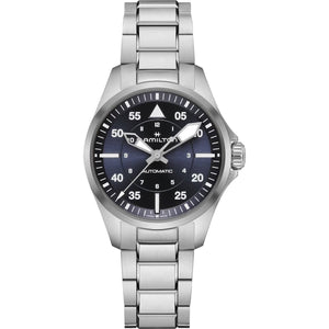 Crafted for true aviation lovers, the Khaki Pilot Auto evokes the spirit of exploration and adventure of the Khaki. Powered by the H-10 automatic movement with an 80-hour power reserve and Nivachron™ balance spring, the 36mm versions answer the trend for smaller watches. While up to the standards of precision for the cockpit, these more compact designs lend themselves to life in the skies and on terra firma. The Khaki Pilot Auto pairs a timeless stainless-steel bracelet with a deep, midnight blue dial and special Super-LumiNova coating for greater readability.