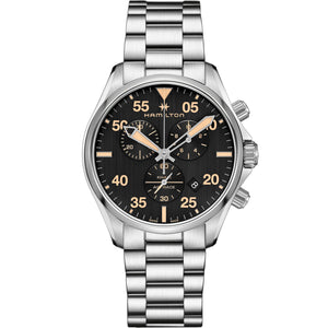 Created specifically with pilots in mind, this sporty quartz chronograph with 44 mm stainless steel case is a perfect mix of aviation style and Swiss-made precision. With sand colored Super-LumiNova numerals, indexes and hands against a sleek black dial, it’s a watch made for the cockpit that also looks good on the ground. Stainless steel case and bracelate with black dial. Case size 44mm. Water resistance upto 100 meters. Quartz movement. Sapphire crystal. Folding clasp.